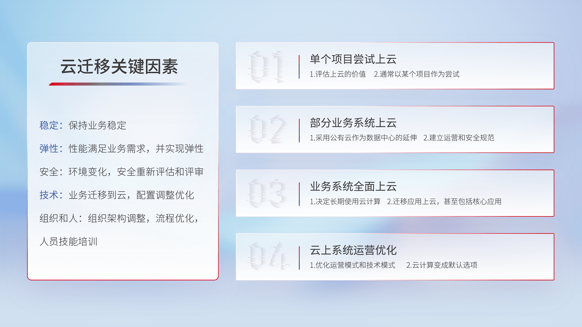 结合实际业务,,,从规划设计、、、云平台选型、、、云原生改造、、、、数据迁移、、、、集成交付,,,,迁移全过程为客户识别最佳上云路径,,做好风险识别管理,,,设计网络架构、、身份权限、、、安全审计合规、、、操作审计、、、日志审计、、监控告警策略、、、多站点容灾设计等,,,对云上基础设施进行整体规划,,提升IT治理水平,,,以满足弹性、、、、高可用、、、、高性能的需求。。。。