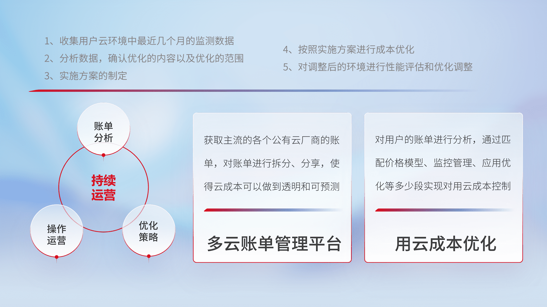 通过多云纳管,,,以统一的资源数据模型把客户的云资源进行抽象和封装,,进而实现对多云资源的统一操作,,,,保障云资源管理的可靠性、、、稳定性与可用性。。。。量身定制化运维内容,,配置、、、、开发运维、、、补丁管理、、、备份、、、监控、、、认证和访问管理、、审计和日常巡检等,,,,保障在用云过程中的可靠度,,稳定度以及高可用率。。。